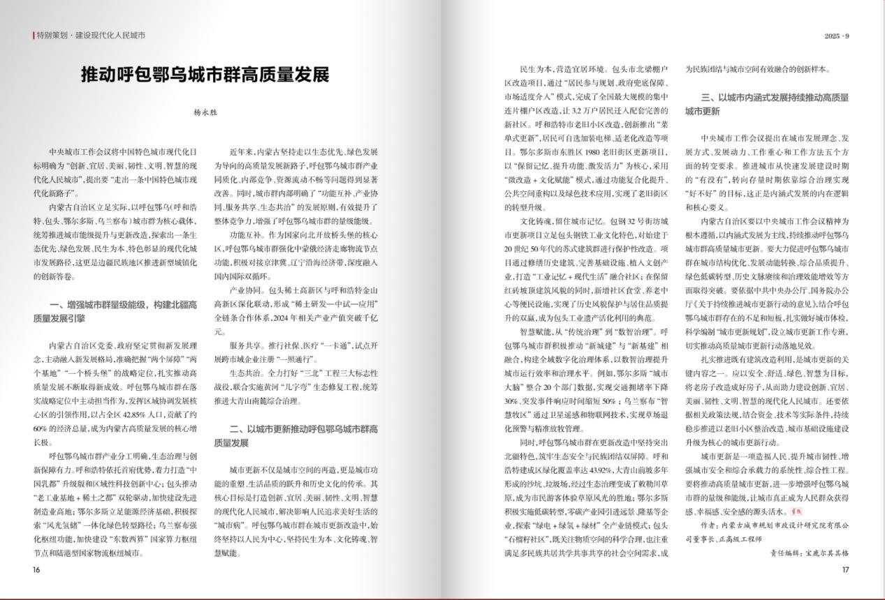 內(nèi)蒙古自治區(qū)以呼包鄂烏城市群為核心載體,通過城市更新推動高質(zhì)量發(fā)展,探索出一條生態(tài)優(yōu)先、綠色發(fā)展、民生為本、特色彰顯的現(xiàn)代化城市發(fā)展路徑。文章從增強城市群量級能級、推動城市更新實踐、促進(jìn)城市內(nèi)涵式發(fā)展三個方面,系統(tǒng)闡述了呼包鄂烏城市群在功能互補、產(chǎn)業(yè)協(xié)同、服務(wù)共享、生態(tài)共治等方面的創(chuàng)新舉措與成效,展現(xiàn)了其在提升城市綜合品質(zhì)、增強區(qū)域競爭力、筑牢北疆生態(tài)與民族團(tuán)結(jié)屏障方面的實踐成效。