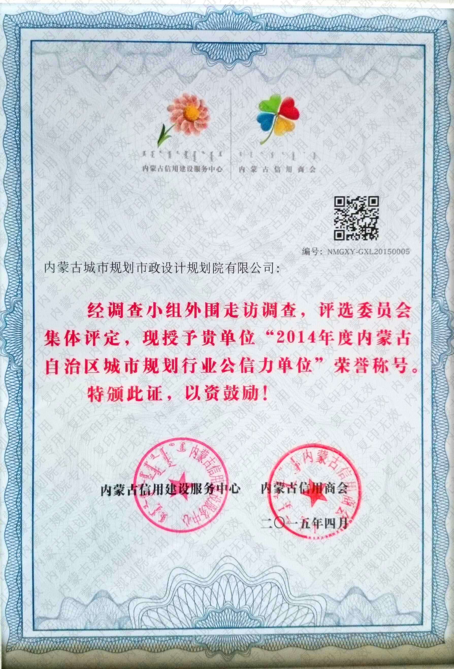 內(nèi)蒙古自治區(qū)城市規(guī)劃行業(yè)公信力單位